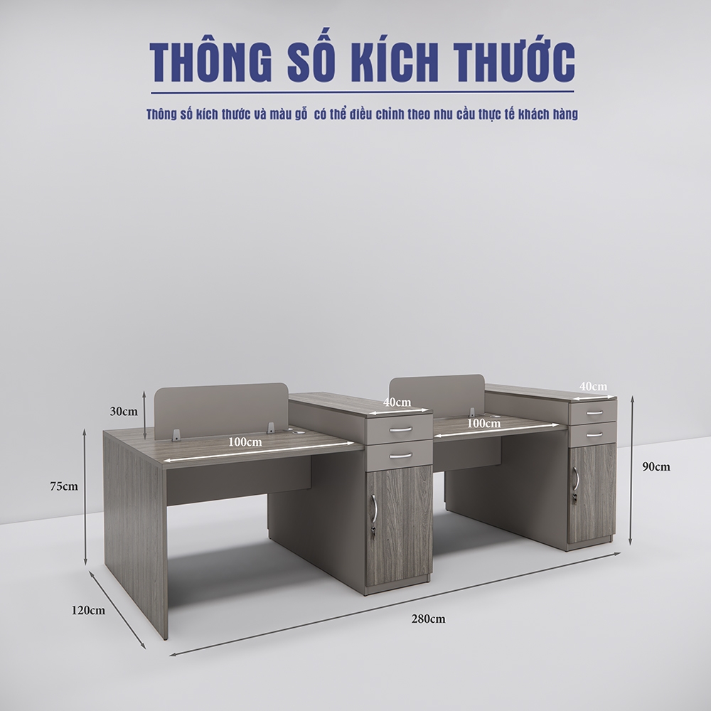 Mỗi chỗ ngồi có mặt bàn rộng 100 x 60 cm, thoải mái đặt máy tính, tài liệu và các vật dụng cá nhân. Đi kèm là hộc tủ kéo rộng 40 cm, có khóa an toàn, giúp lưu trữ hồ sơ và đồ dùng cá nhân gọn gàng, tiện lợi.