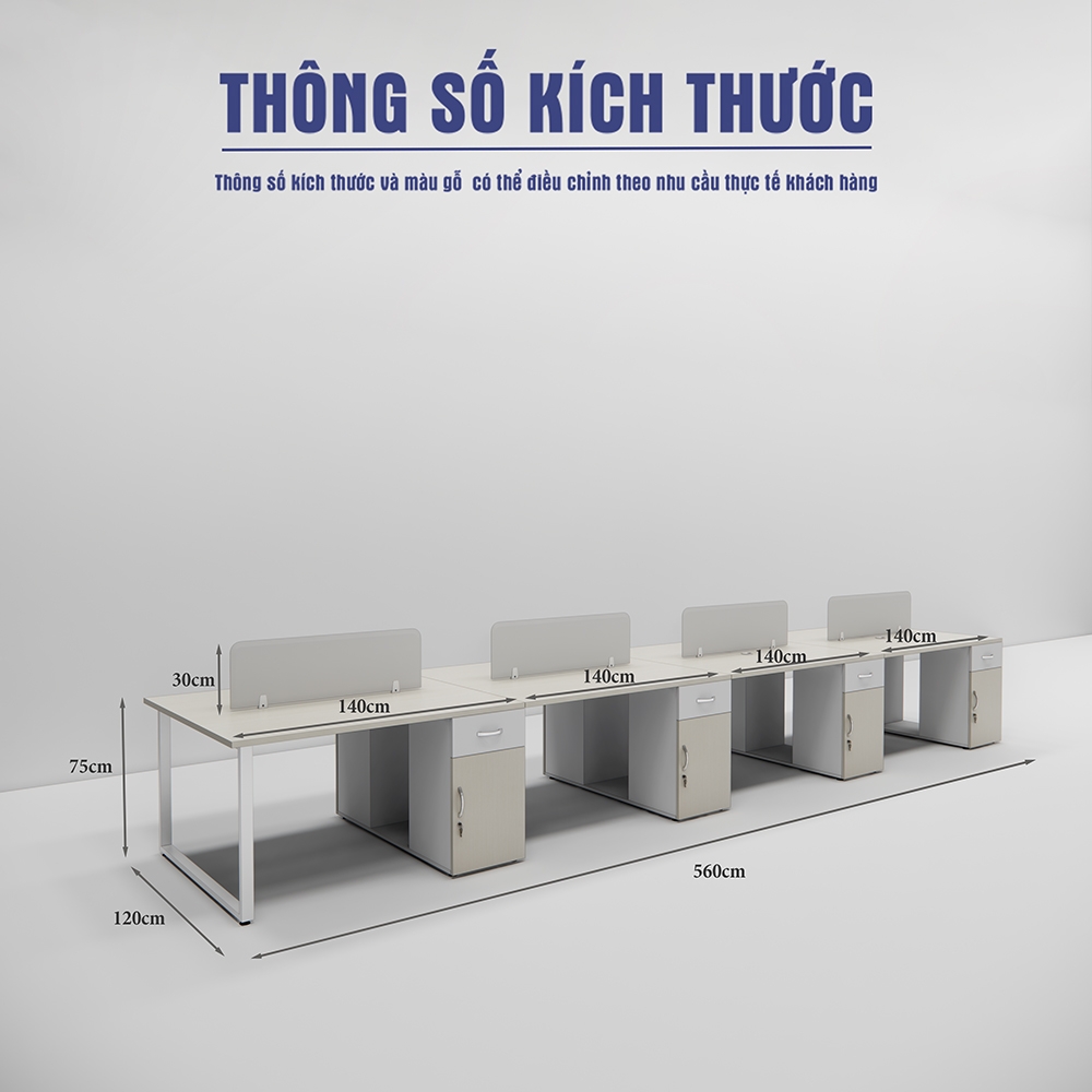Khách hàng có thể lựa chọn màu sắc mặt bàn và vách ngăn theo sở thích hoặc phong cách văn phòng. Một số màu phổ biến bao gồm: