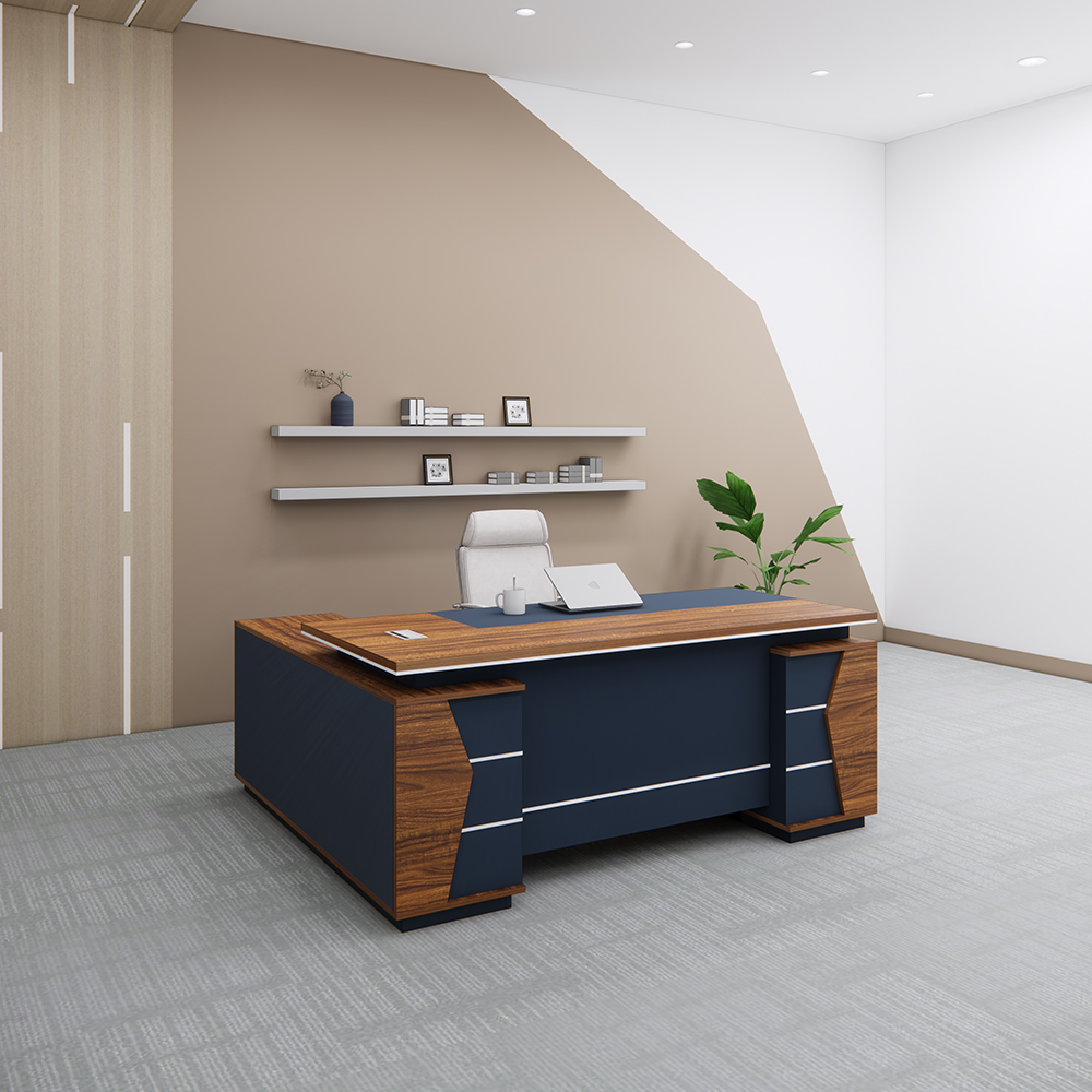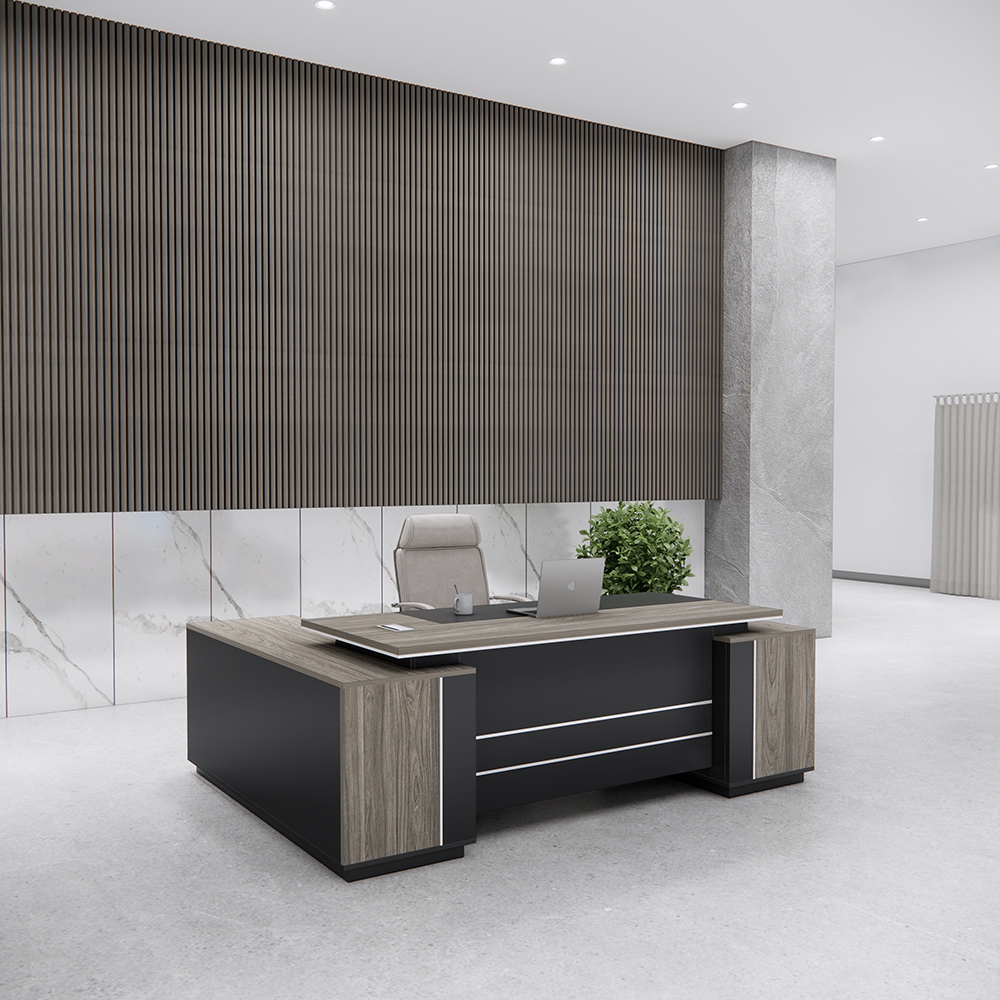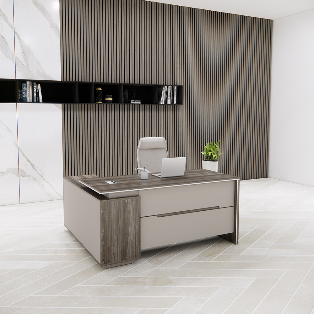 Gỗ công nghiệp MFC (Melamine Faced Chipboard) phủ Melamine là vật liệu được ưa chuộng trong sản xuất nội thất văn phòng hiện đại. Lớp phủ Melamine không chỉ mang lại vẻ ngoài sang trọng với đa dạng màu sắc và vân gỗ tự nhiên, mà còn có khả năng chống trầy xước, chống ẩm mốc và dễ dàng vệ sinh. Điều này giúp bàn giám đốc luôn giữ được vẻ mới mẻ và bền bỉ theo thời gian.