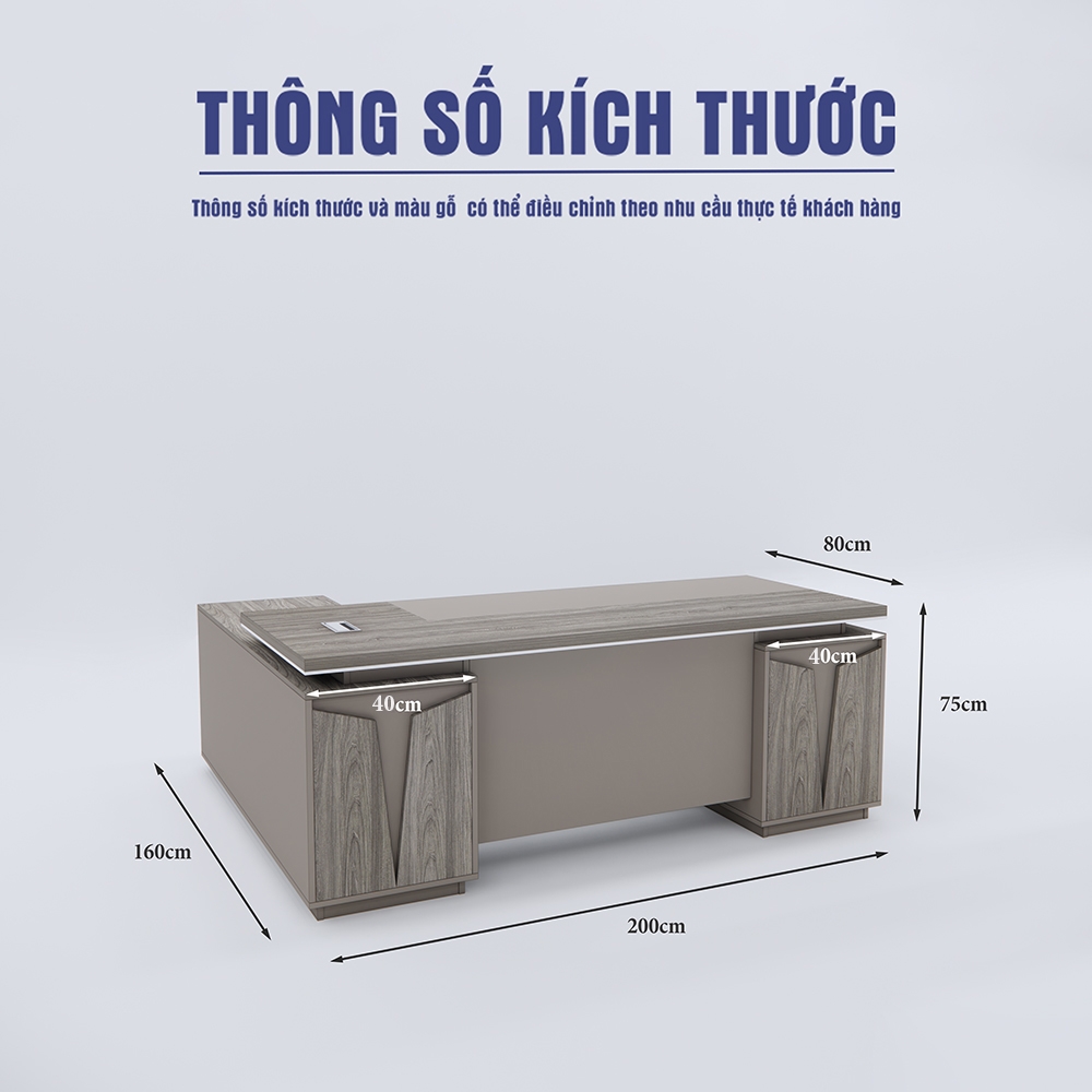 Thiết kế khoa học, tỉ mỉ từng chi tiết: kích thước tiêu chuẩn 200cm x 160cm x 75cm, giúp tối ưu hóa không gian làm việc, mang lại sự thoải mái khi sử dụng.
