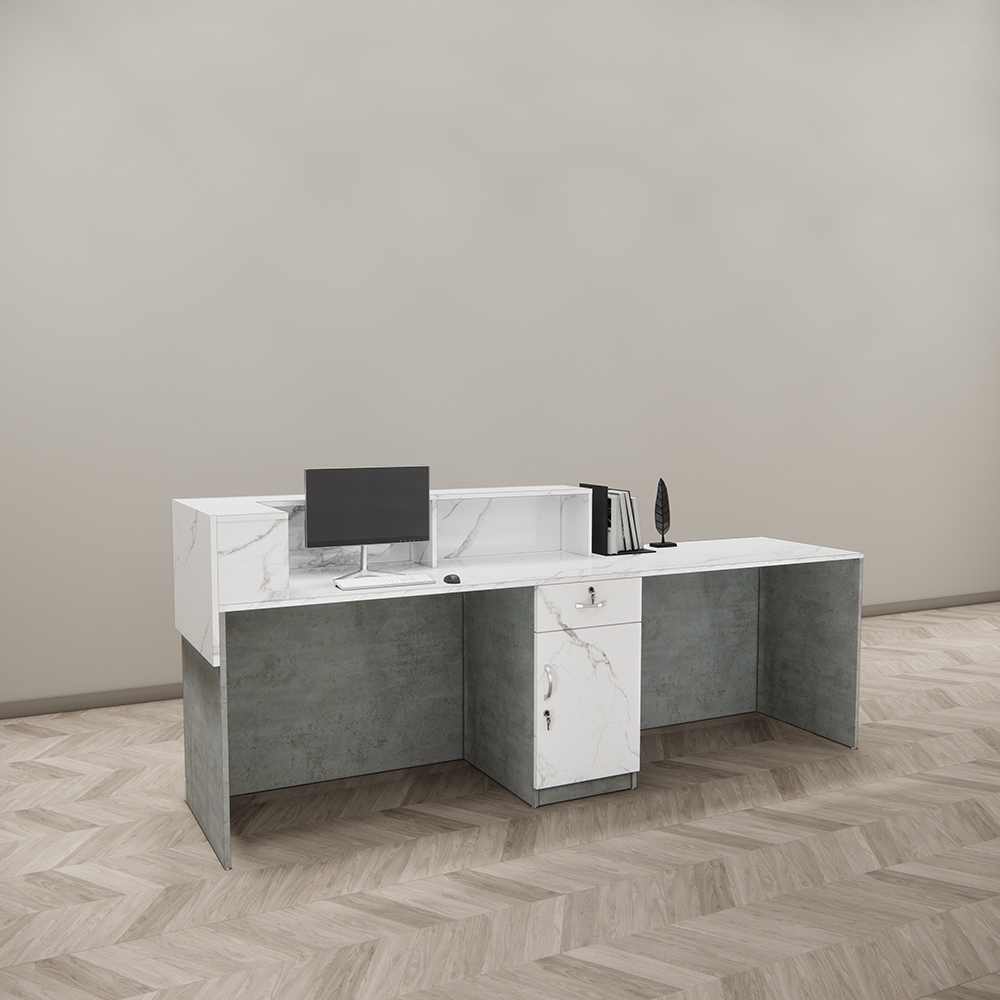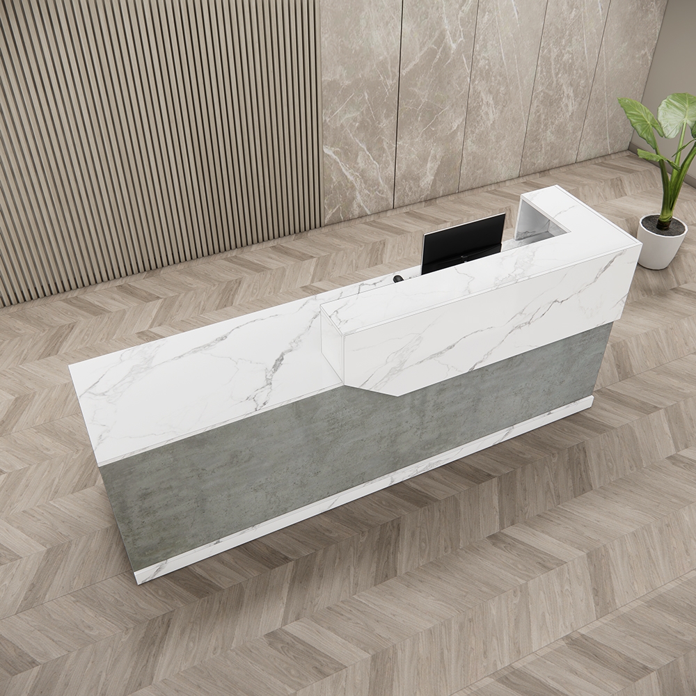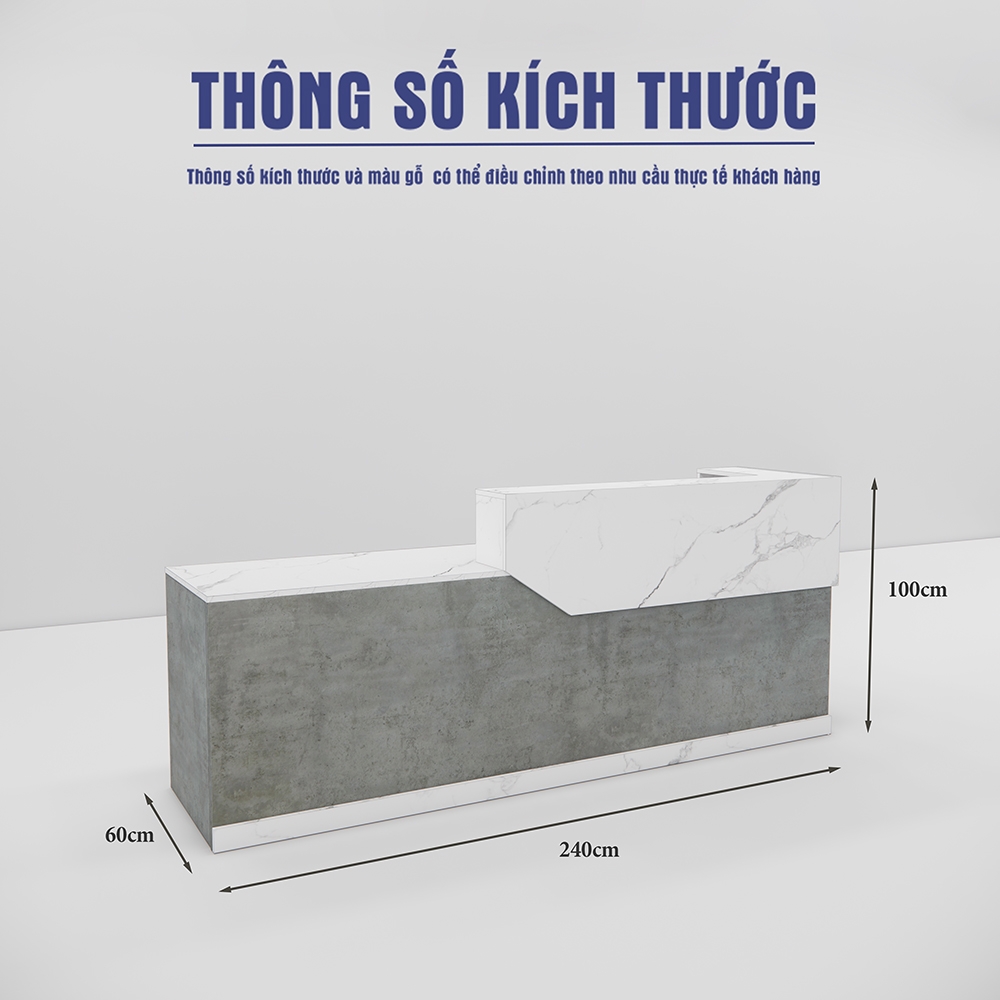 Quầy lễ tân SMQLT016 nổi bật với sự kết hợp độc đáo giữa vân đá trắng tinh tế và lớp phủ giả bê tông xám hiện đại. Thiết kế hình khối vuông vức, cắt góc tinh tế mang đến vẻ ngoài chắc chắn và sang trọng, phù hợp với nhiều phong cách không gian từ văn phòng công ty, showroom đến spa, phòng khám.