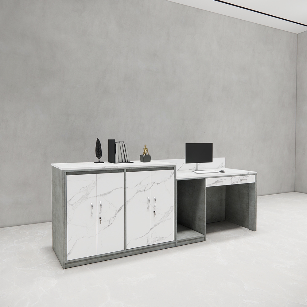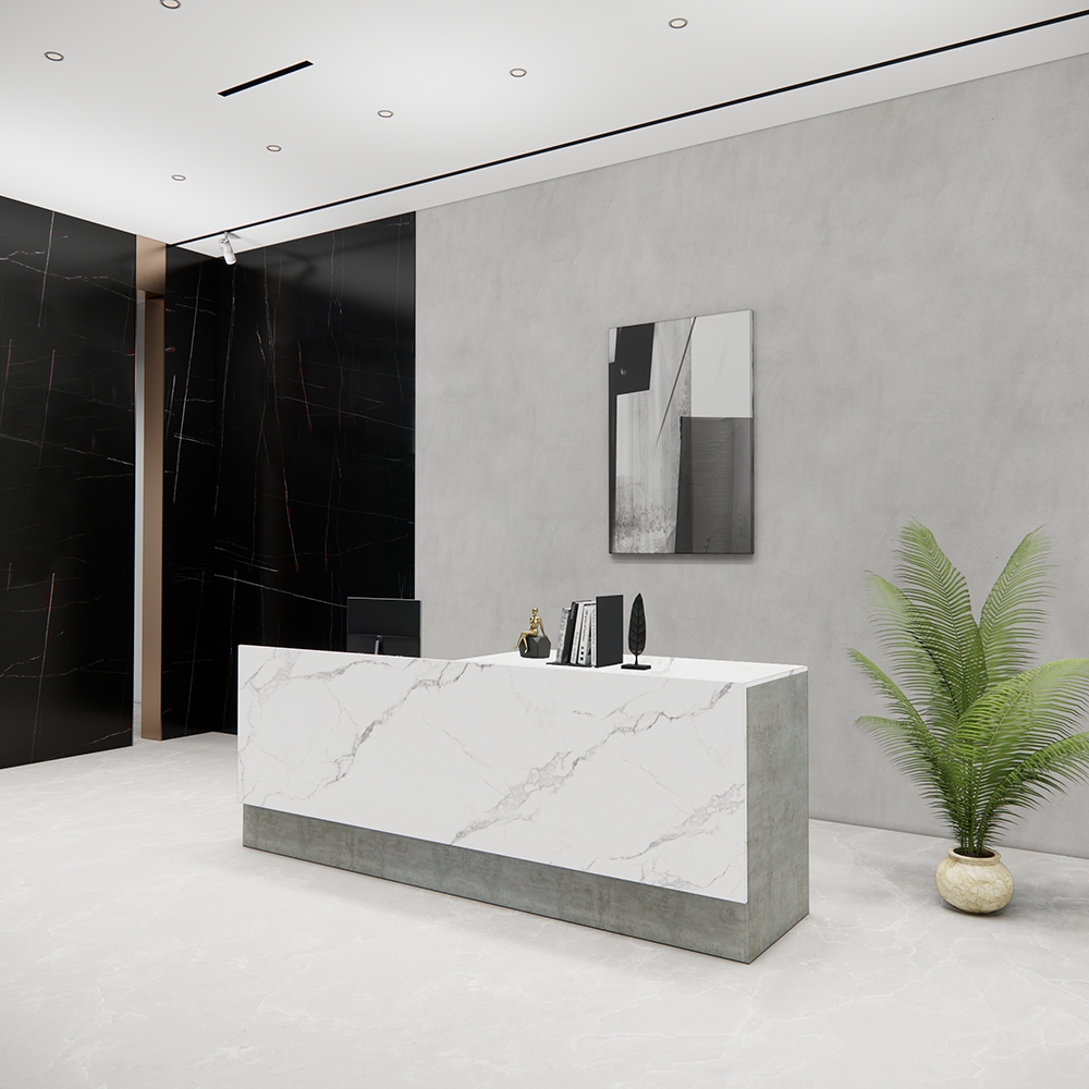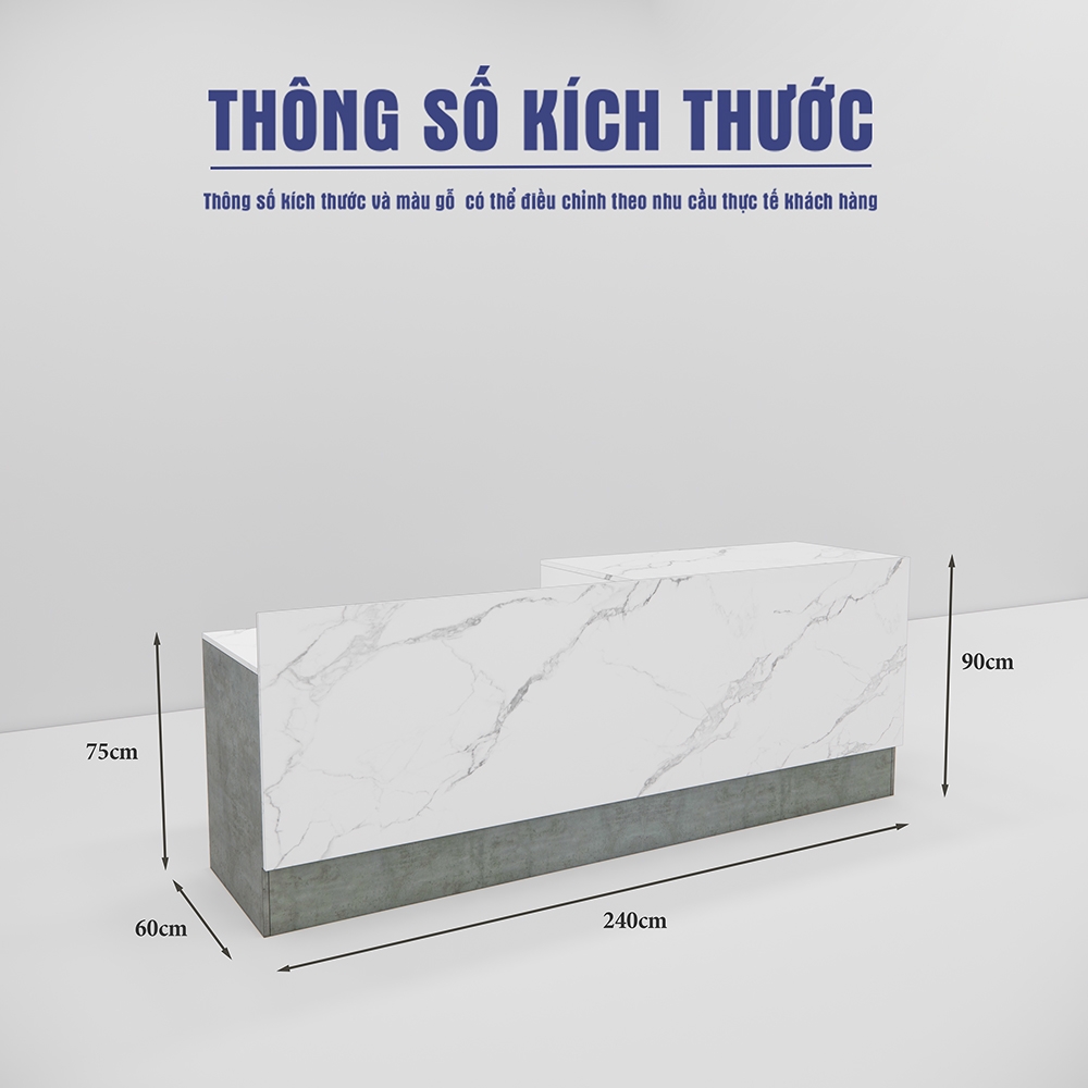 Màu sắc hiện đại: Tông trắng vân đá kết hợp phần chân xám tạo cảm giác tinh tế và chuyên nghiệp.