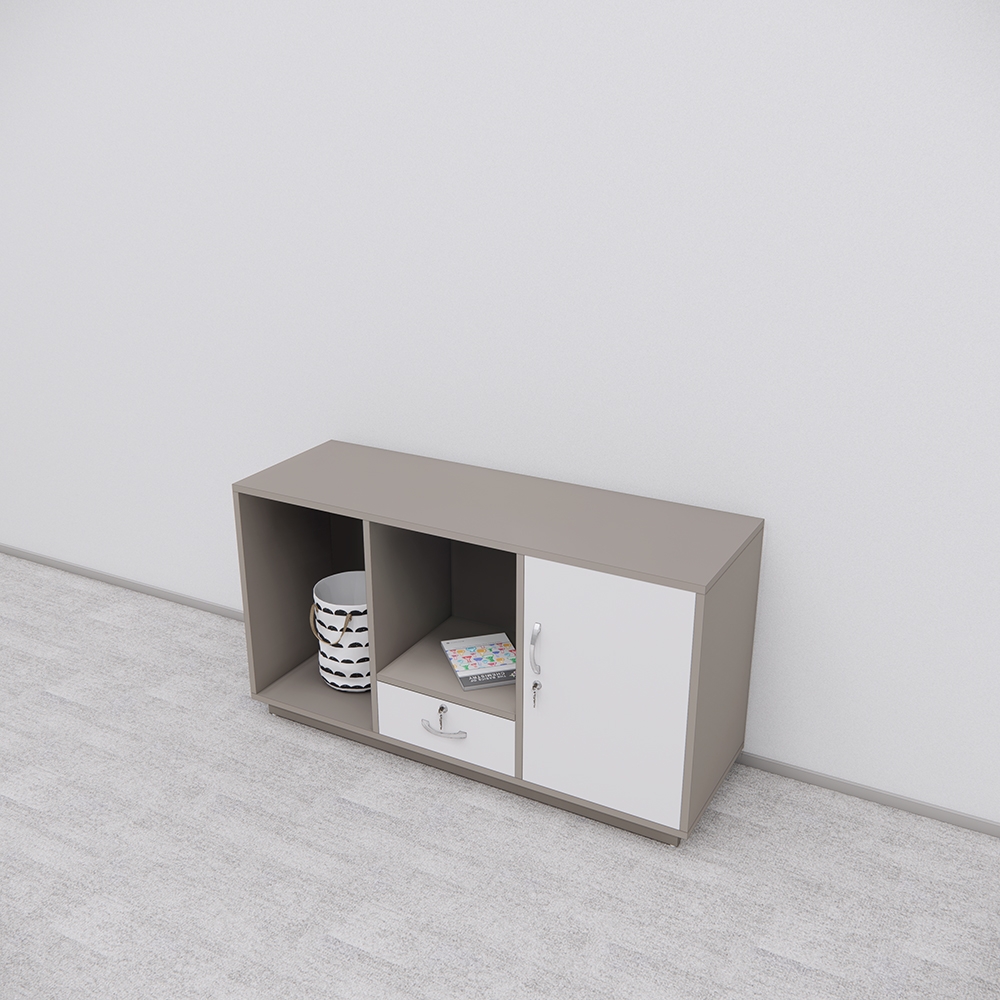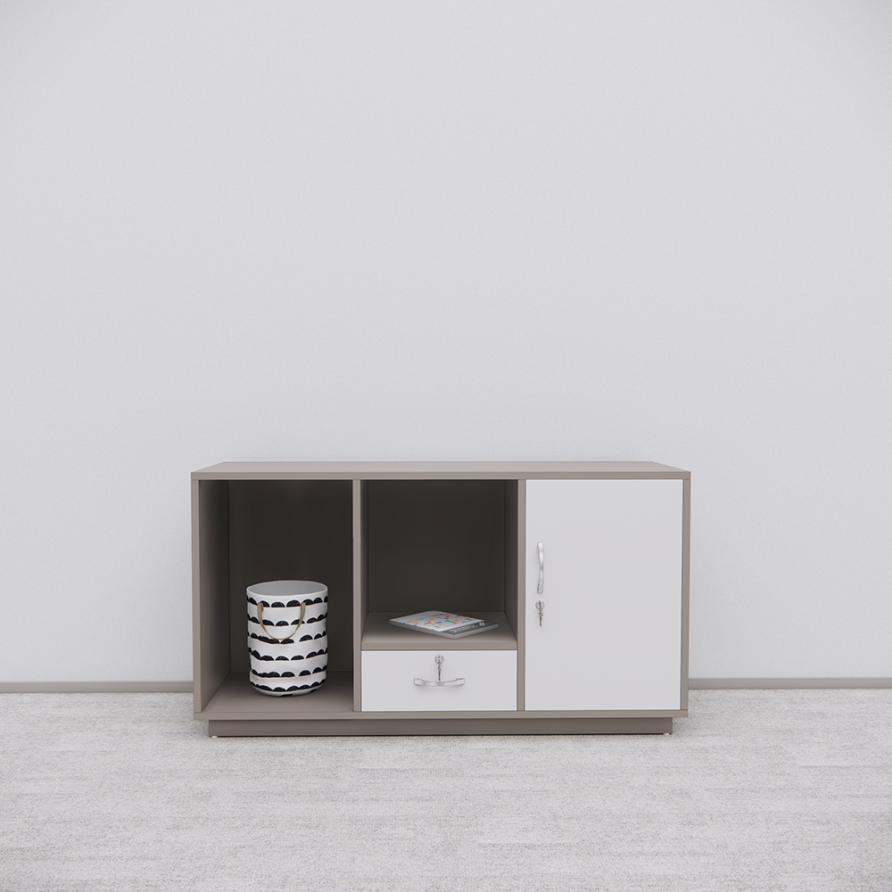 Tủ SMTBGD002 có kiểu dáng hình khối ngang, phối màu xám – trắng trang nhã, phù hợp với đa dạng mẫu bàn giám đốc từ đơn giản đến hiện đại. Cấu trúc gồm 2 ngăn trống, 1 ngăn kéo và 1 ngăn cánh mở có khóa giúp phân loại vật dụng tiện lợi và an toàn.